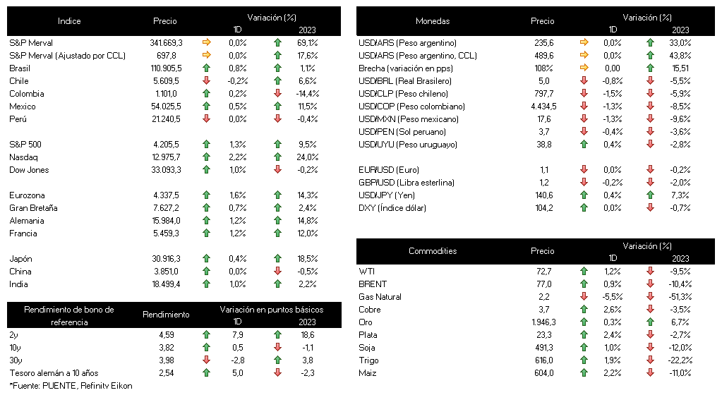 Los principales índices de acciones de Estados Unidos el día viernes cerraron positivos. El S&P 500 reveló una suba de +1,3%, el Dow Jones mostró un incremento de +1%, mientras que el Nasdaq sobresalió al crecer +2,2%. Por otro lado, los rendimientos de los bonos se ampliaron, principalmente en el tramo corto de la curva, y el rendimiento del bono a diez años cerró 3,82%. Cabe destacar que en en el día de hoy será feriado en los mercados de Estados Unidos