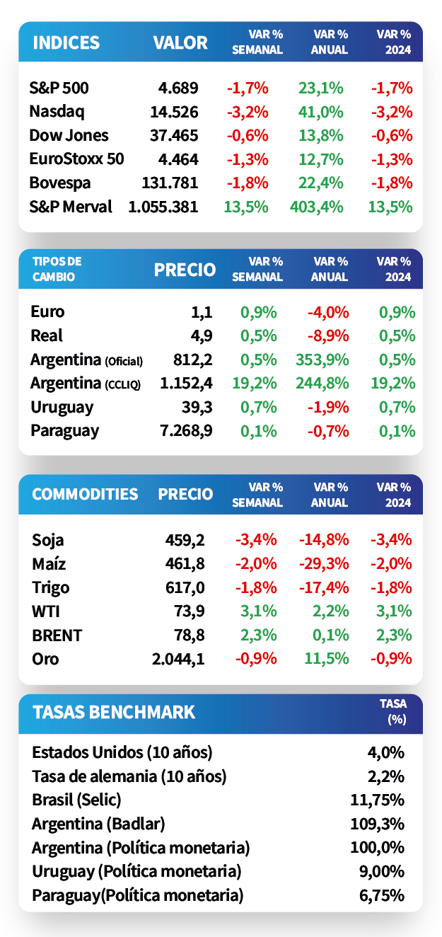 En este contexto, los rendimientos de los bonos del Tesoro americano se ampliaron a lo largo de todos los vencimientos durante la primera semana del año. Así, el rendimiento a 1 año pasó de 4,76% a 4,84%, el de 3 años de 4,01% a 4,17% y el correspondiente a 10 años desde 3,88% a 4,05%. En tanto, el rendimiento promedio de los bonos corporativos con Grado de Inversión (ETF LQD) se ubicó en 5,3%. En otro orden, los índices de acciones cerraron a la baja, siendo el Nasdaq el que presentó la merma más pronunciada (-3,2%).